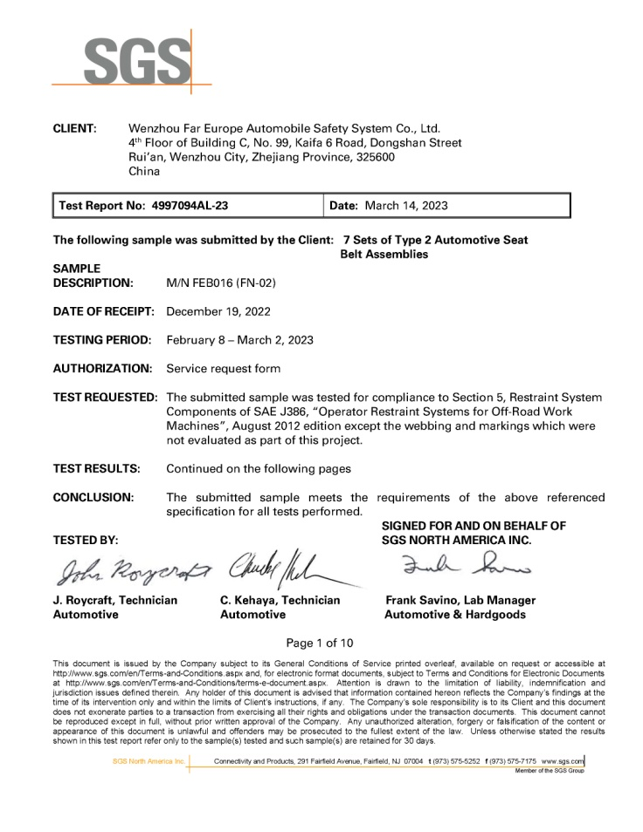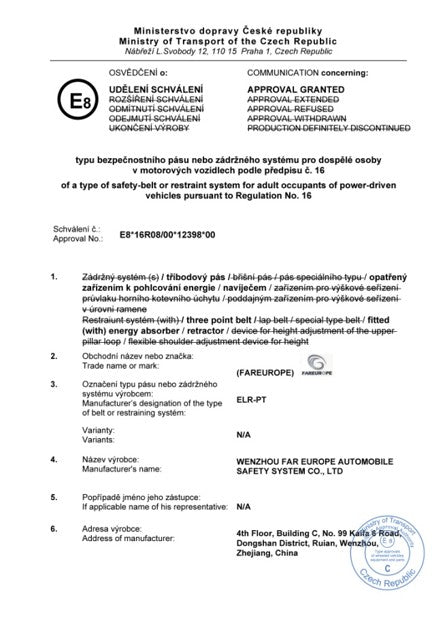 Wenzhou Far Europe Automobile Safety System Co., Ltd is located in Wenzhou City of Zhejiang Province, which has around 10 years experience in production of automobile seat belt, seat belt reminder, seat belt webbing and child safety belt parts. Our products are widely sold overseas except for domestic market and have been won good appraises.