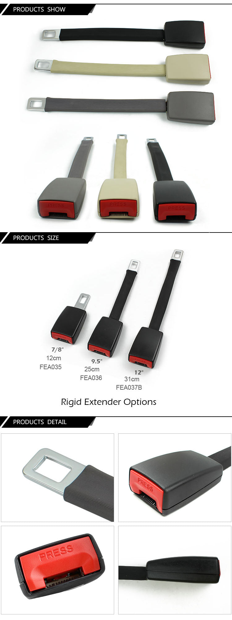 Rigid Stem Safety Belt Ectender is specially designed for big people, pregnant women, firefighters and service personnel. These safety belts have heavy equipment safety belts. People with limited mobility and range of activities do not need to install. The extender can be inserted directly In your existing seat belt and buckle, and you can easily move it between cars.The total length of Rigid Stem Safety Belt Ectender is 31cm, and extenders of other lengths can be provided according to customer requirements.
