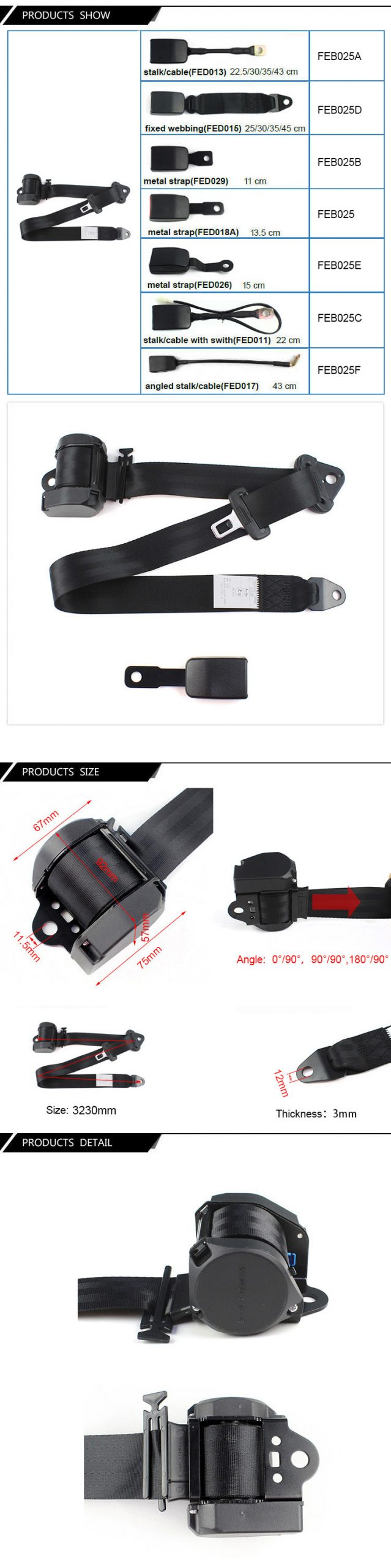 Far Europe Car Universal Seatbelt is 3 point seat belt .There are many colors for you to choose:Black,Gray,Beige,Blue,Red and Orange. Universal Seatbelt is easy to install 3 point seat belt for front or rear seat applications and it is apply to most of car.Universal Seatbelt dual adjustment at shoulder and lap positions.Fully adjustable hardware with quick release camlock. Extra long adjustable straps for better fit any size driver. Provide added safety in driving, by being firmly secured in the seat